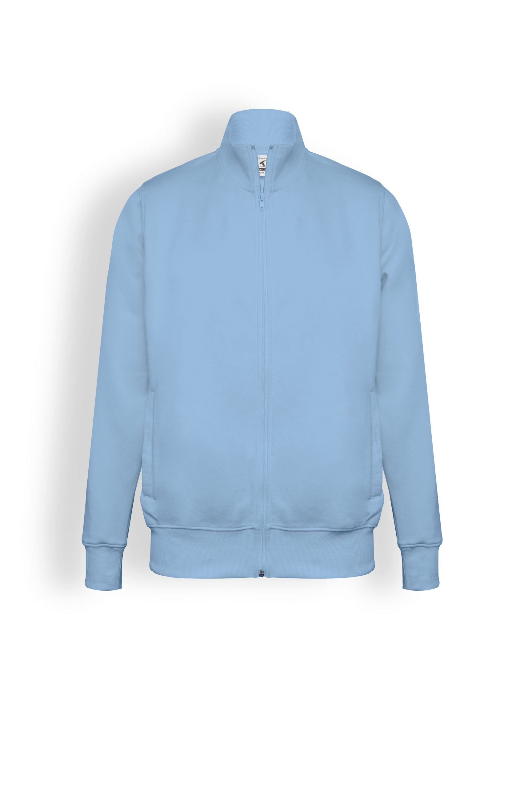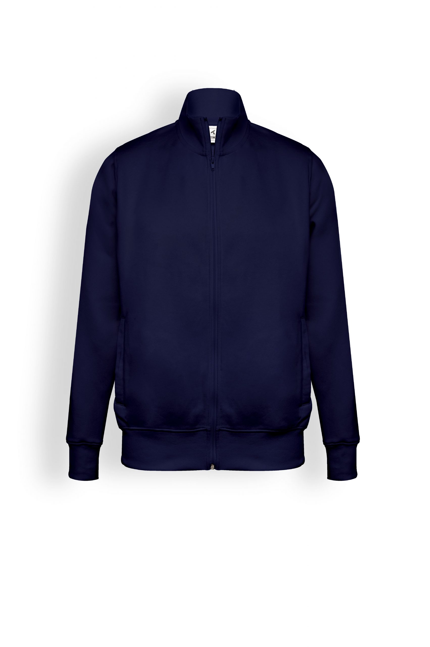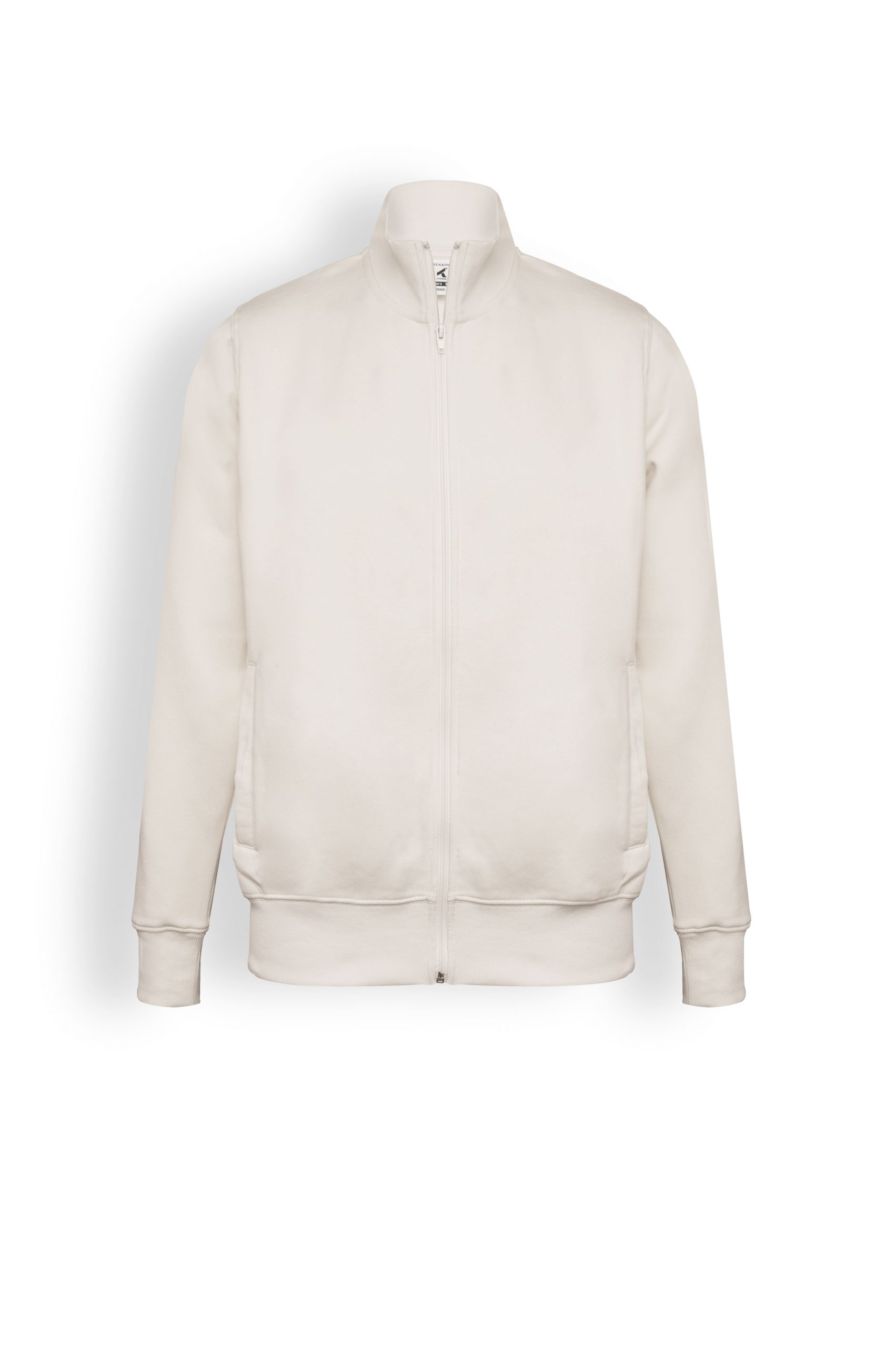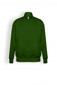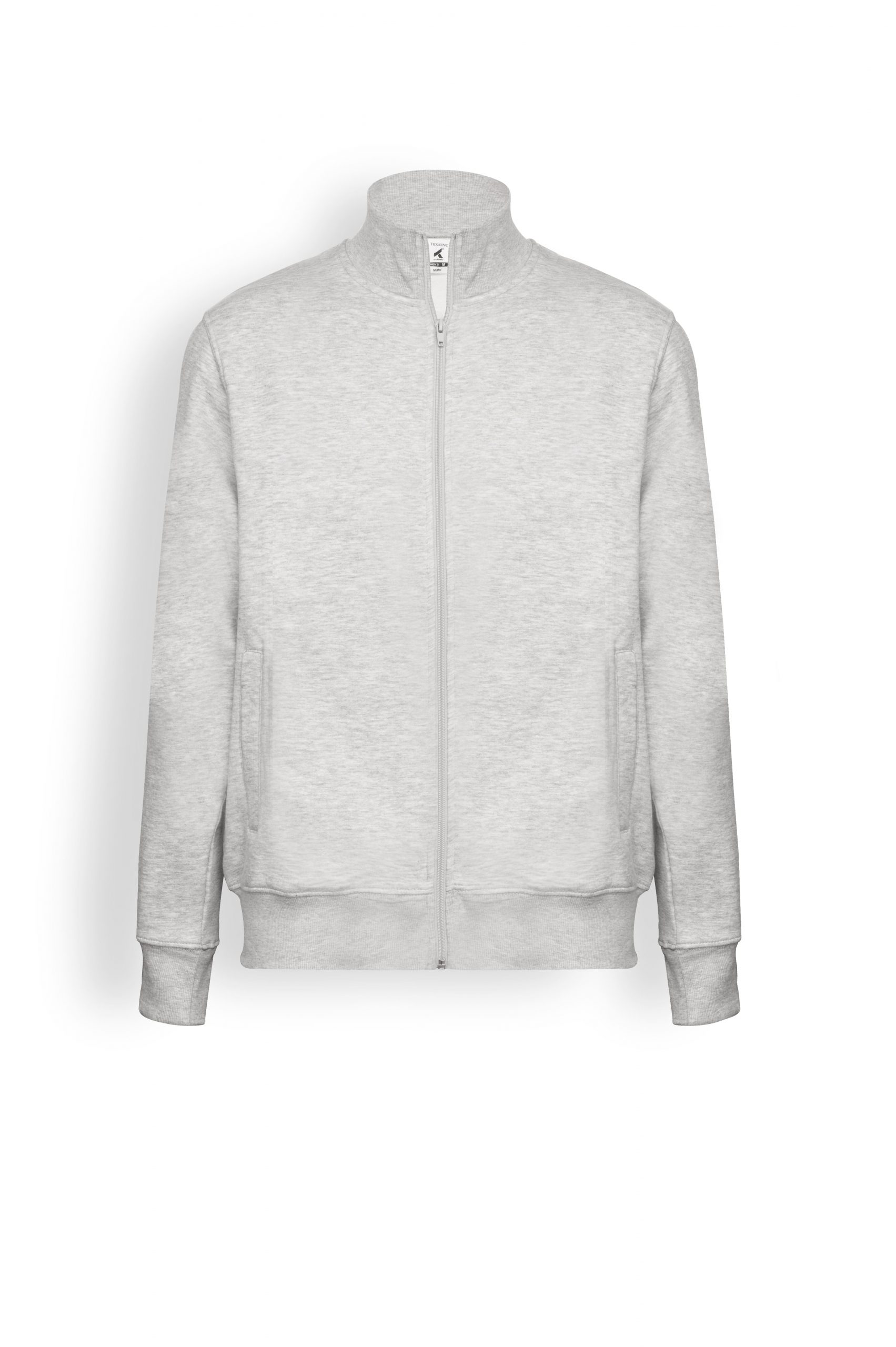 Sudadera unisex con cremallera frontal y cuello alto. Cremallera al tono. Dos bolsillos laterales con ribete del mismo tejido. Puños y cinturilla en canalé 2×1 con elastano. Cubrecosturas del mismo tejido.