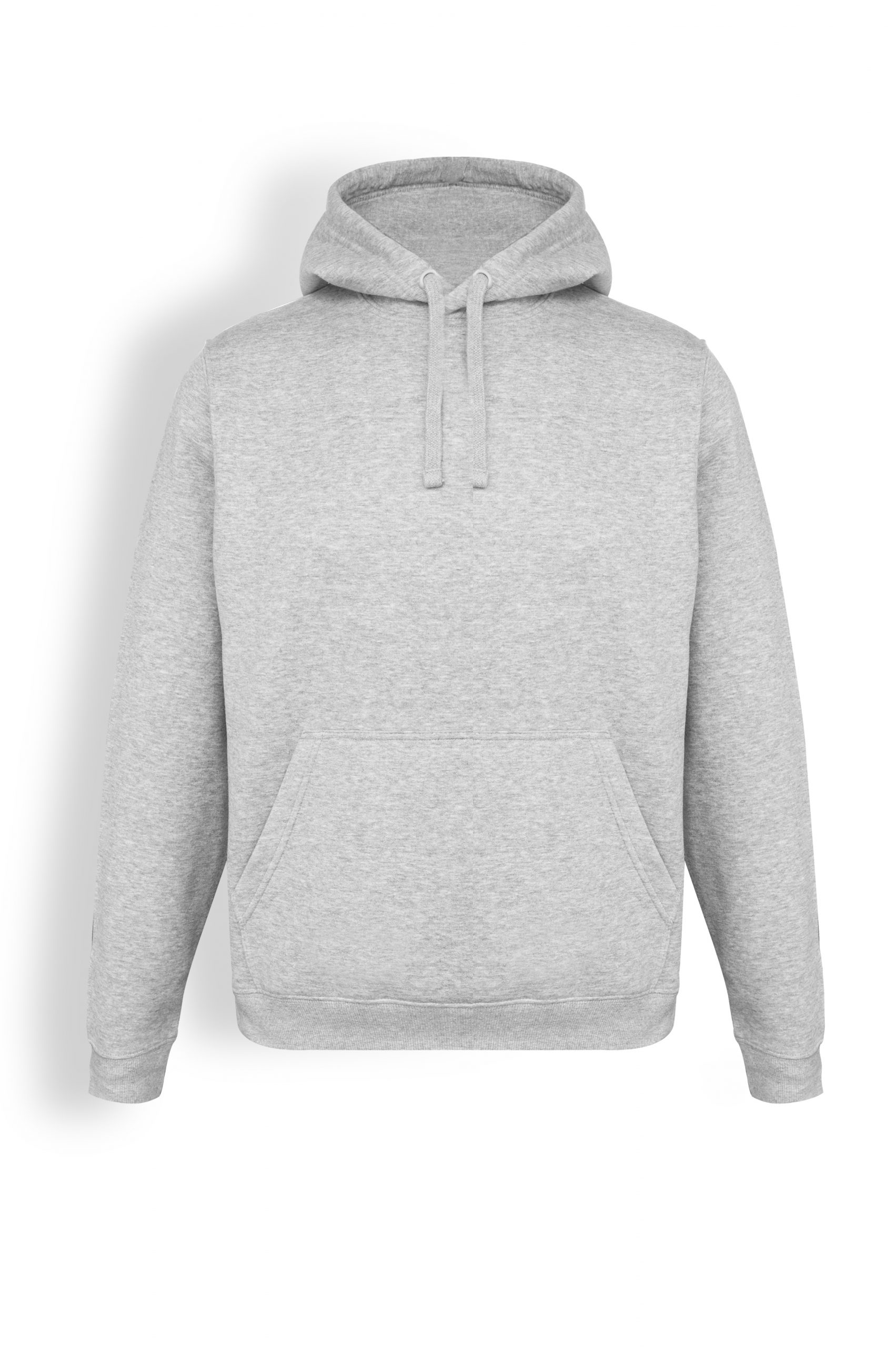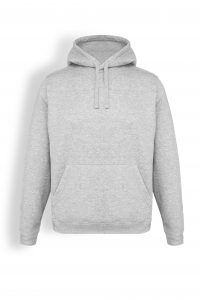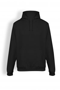 Sudadera unisex con capucha, con cordón contrastado ajustable, cubrecosturas en el cuello y bolsillo canguro. Punto canalé con elastano 1×1 en puños y cintura.